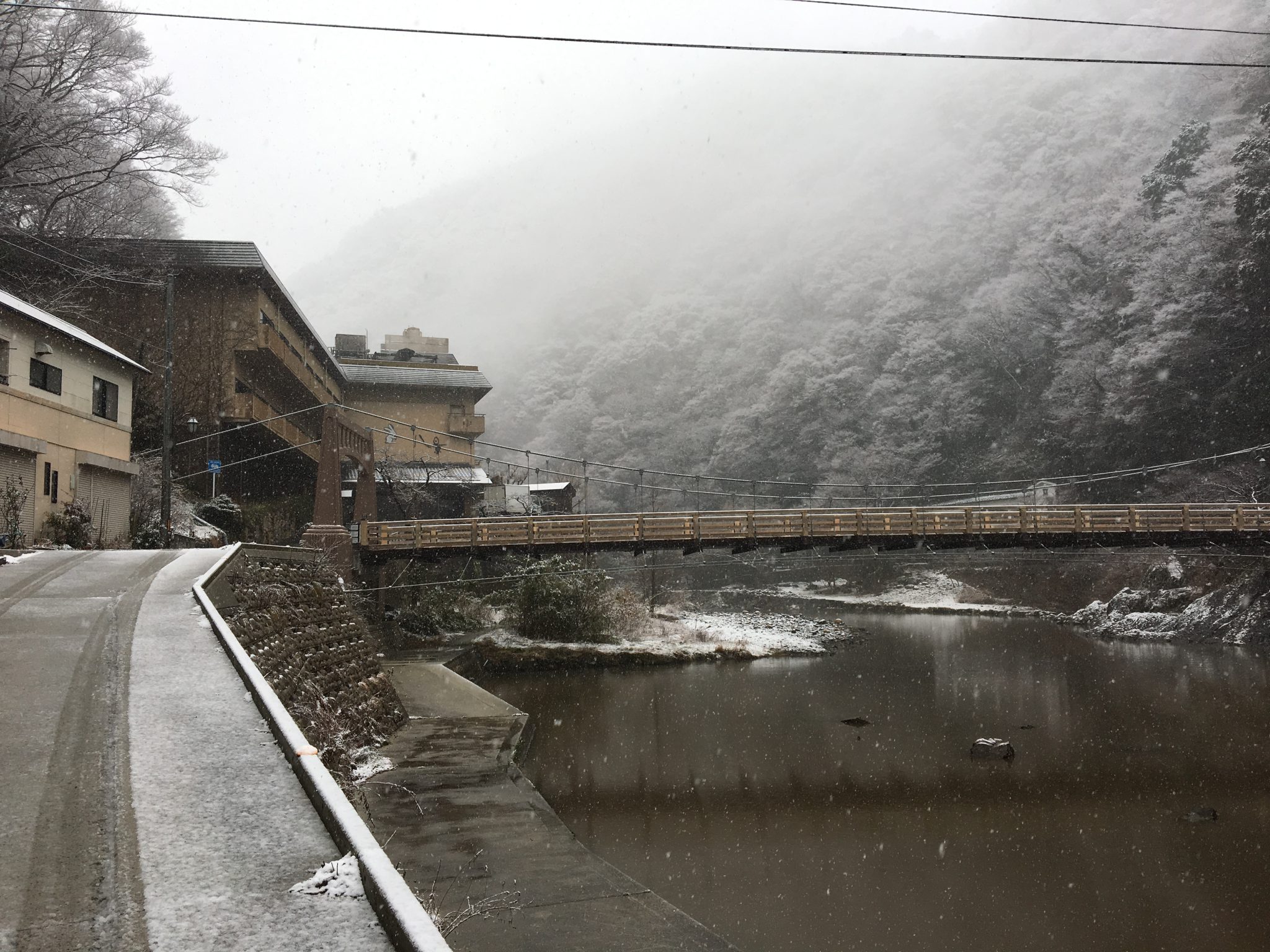 お昼頃から湯原は雪が降り始めました、道路にそこまでは積もっていませんが