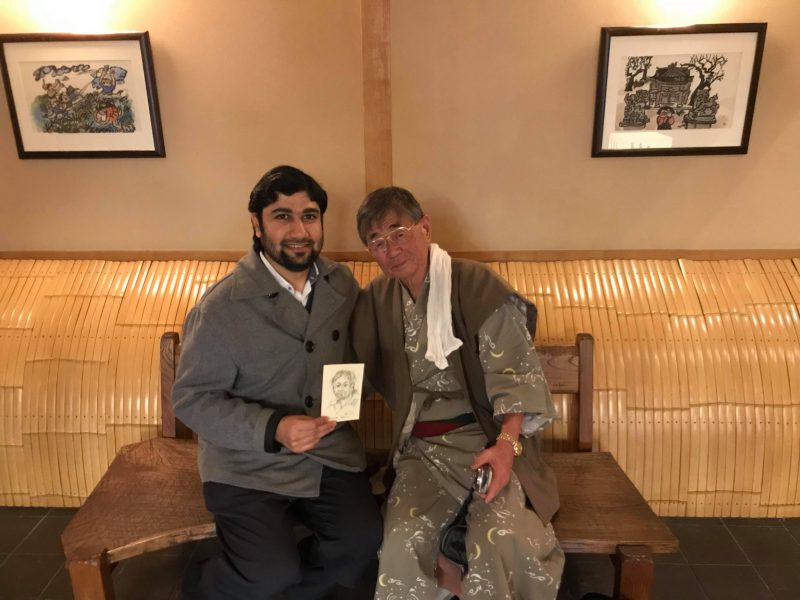 Last night it becomes cold at Yubara Hot Spring. We have a guest at Hakkei Sketched a rabbit, Okami san & my image. The guests gave us a present of our drawing. In a pleasant atmosphere, little rain and dinner with family complete holiday.