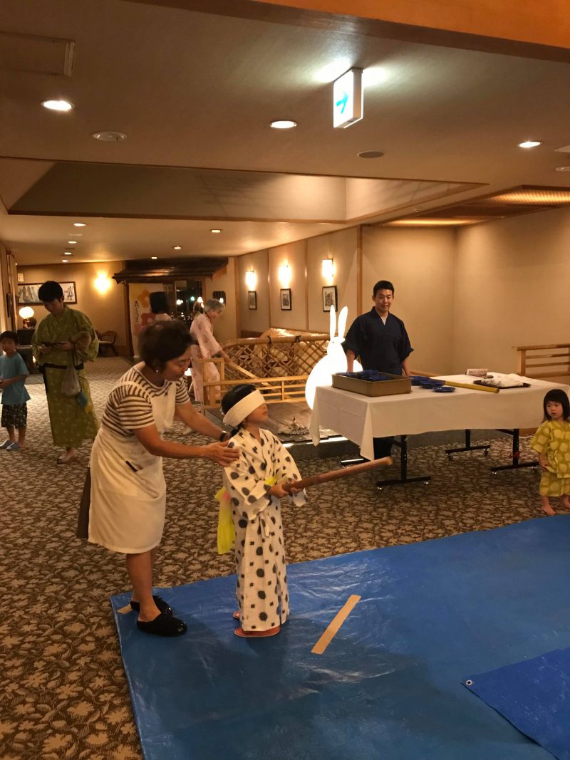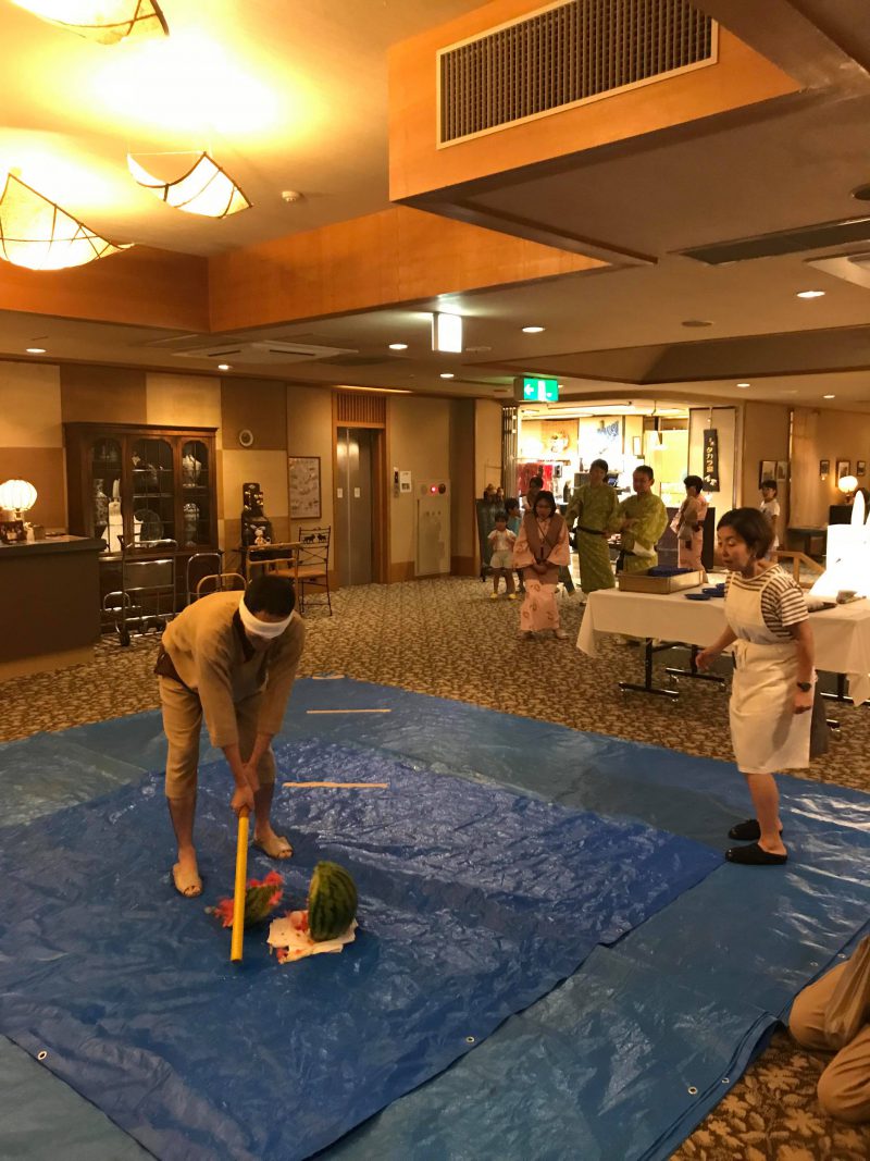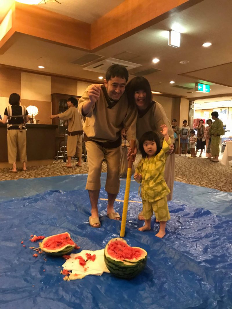 Suikawari (meaning watermelon splitting) is a traditional Japanese game quite large in Japan in the summer months. Watermelon Splitting is a traditional Japanese game of watermelon splitting with a stick while blindfolding.