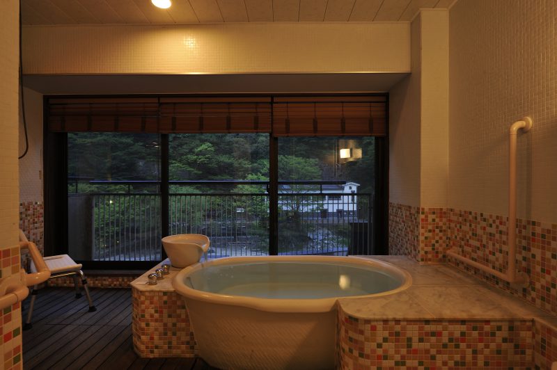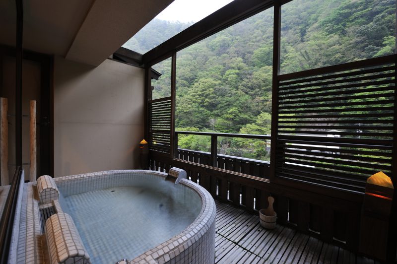 スイートルームのお風呂は室内にあるのですが、窓を開けると露天風呂のように楽しめる半露天風呂になっています。目の前旭川の流れる音や自然を感じながら温泉に入ることもできます。