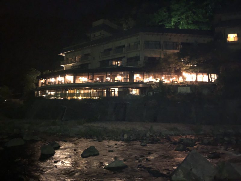 砂湯の夜は一変して目の前の旅館の光と空の星が眩しくていい景色です。なんか今年は吊り橋もライトアップされるし、何もない温泉街にロマンティック要素増えてきてるみたいです。