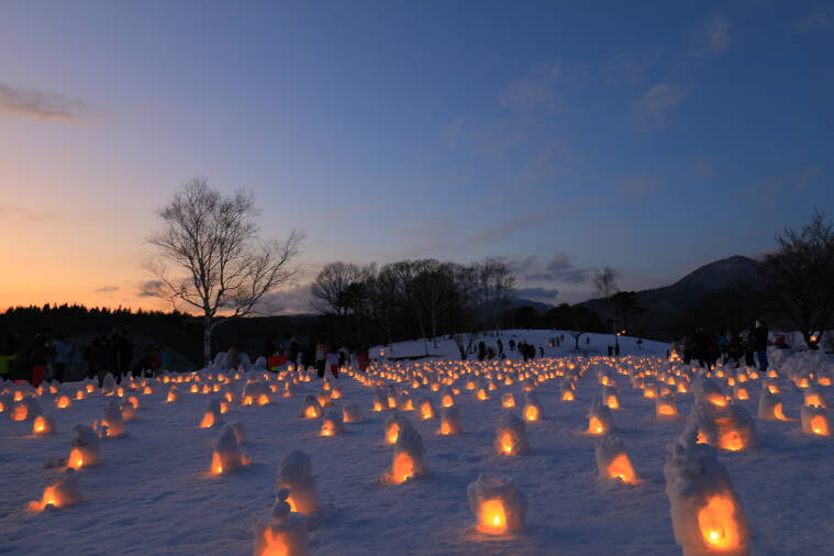 Visit huts made of snow and enjoy sledding, at Kyukamura Hiruzen-Kogen. Popular with couples and families.